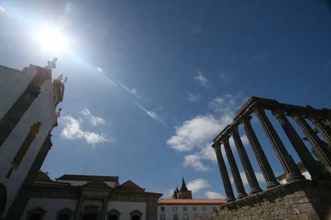 Die größte und schönste Stadt des Alentejo ist ein Weltkulturerbe der Renaissance. Sie ist nicht museal, sondern höchst lebendig. Mit ihren engen, von Bogengängen gesäumten kleinen Gassen besitzt der herrliche Ort einen stark maurischen Charakter. Im Norden steht die Sé, ab 1186 im Übergangsstil von der Romanik zur Gotik errichtet. Sie ist eine der eindrucksvollsten mittelalterlichen Bischofskirchen Protugals. Neben Museen steht auf hohem Sockel der Dianatempel mit 14 korinthischen Granitsäulen. Gegenüber verbirgt sich hinter massigen Mauern die Pousada dos Lóios in einem spätgotisch-maurischen Kloster. Die gotische Kirche Sâo Francisco am Stadtpark ist ein Juwel. Von Èvoras antiker Vergangenheit künden die fast vollsändig erhaltene römische Ringmauer und der einzige verbliebene römische Tempel der Iberischen Halbinsel. Wer die traditionsreiche Stadt mit ihren 30 Kirchen, Klöstern und Palästen kennenlernen will, braucht mehr als einen Tag.