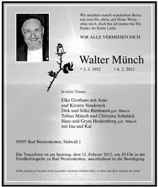 Walter Münch, durch Fotografien in zahlreichen Büchern, Kalendern und Ausstellungen bekannt. Große Resonanz finden die aktuellen Lippstadt-Bildbände mit deutsch-englischem Text, die Bestseller im Kreis Soest. "Mein Lippstadt" ist in dieser zweisprachigen Form das 1. Kinder- buch Deutschlands. Der freie Reise- und FotoJournalist agiert seit drei Jahr- zehnten als journalistischer Mitarbeiter der Tageszeitung "Der Patriot", der Stadt Lippstadt und im Umland. TonDiaShows mit fotografischen Impressionen zeigt der beliebte Dozent bei Volkshochschulen und Heilbädern. In dieser Form verwirklichte er als Erster die Idee zu einem Lippstadt-Porträt. Die amerikanischen Traumziele von New York bis zur Route 66, deren TonDiaShows er mit seiner Partnerin Elke Grothaus zusammenstellte, finden in ausverkauften Theatern Beachtung. Als erster Referent Deutschlands präsentierte der PanoramaFotograf sie mit musikalischer Untermalung auf digitalem Tonträger. Fotografie und Kunst eint er in der FotoKunst- Vision "Südafrika - Kapstadt bis Johannesburg". Die FotoAusstellung "Route 66 - 85 Jahre Amerikas Highway" und der FotoKunstKalender 2012 finden viel Anklang. Sein Slogan: "Beste Blende".