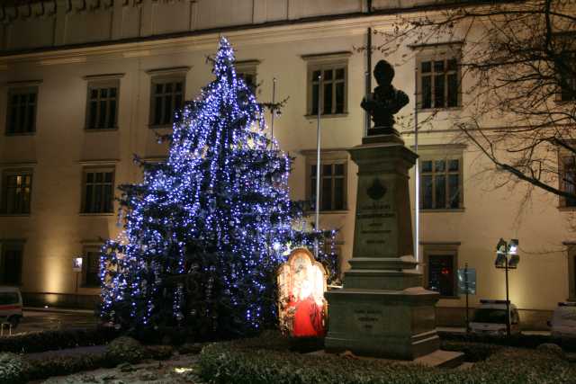 Zwölf Apostel weisen den Weg zur Peter- und Paul-Kirche. Ganz in der Nähe sind der kleine Marktplatz und das Theater im weihnachtlichen Glanz, sowie das Rathaus.