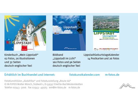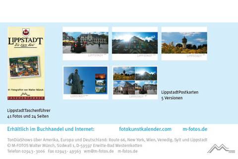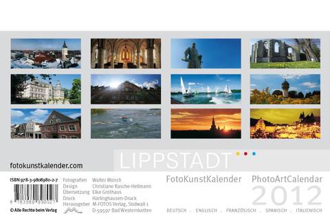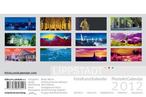 Erstmalig erschien ein FotoKunstKalender Lippstadt 2012 in den fünf Sprachen Deutsch, Englisch, Französisch, Spanisch und Italienisch. Die limitierte Auflage mit 1.000 Stück hat den Verkaufspreis von Euro 8,80. Jeweils sind neben dem Titelbild noch 12 Motive als Foto und verfremdete FotoKunstVision vertreten. Der FotoKunstKalender hat die Maße 13,5 x 9,0 cm und ist zum Aufstellen und Hängen gleichermaßen verwendbar.